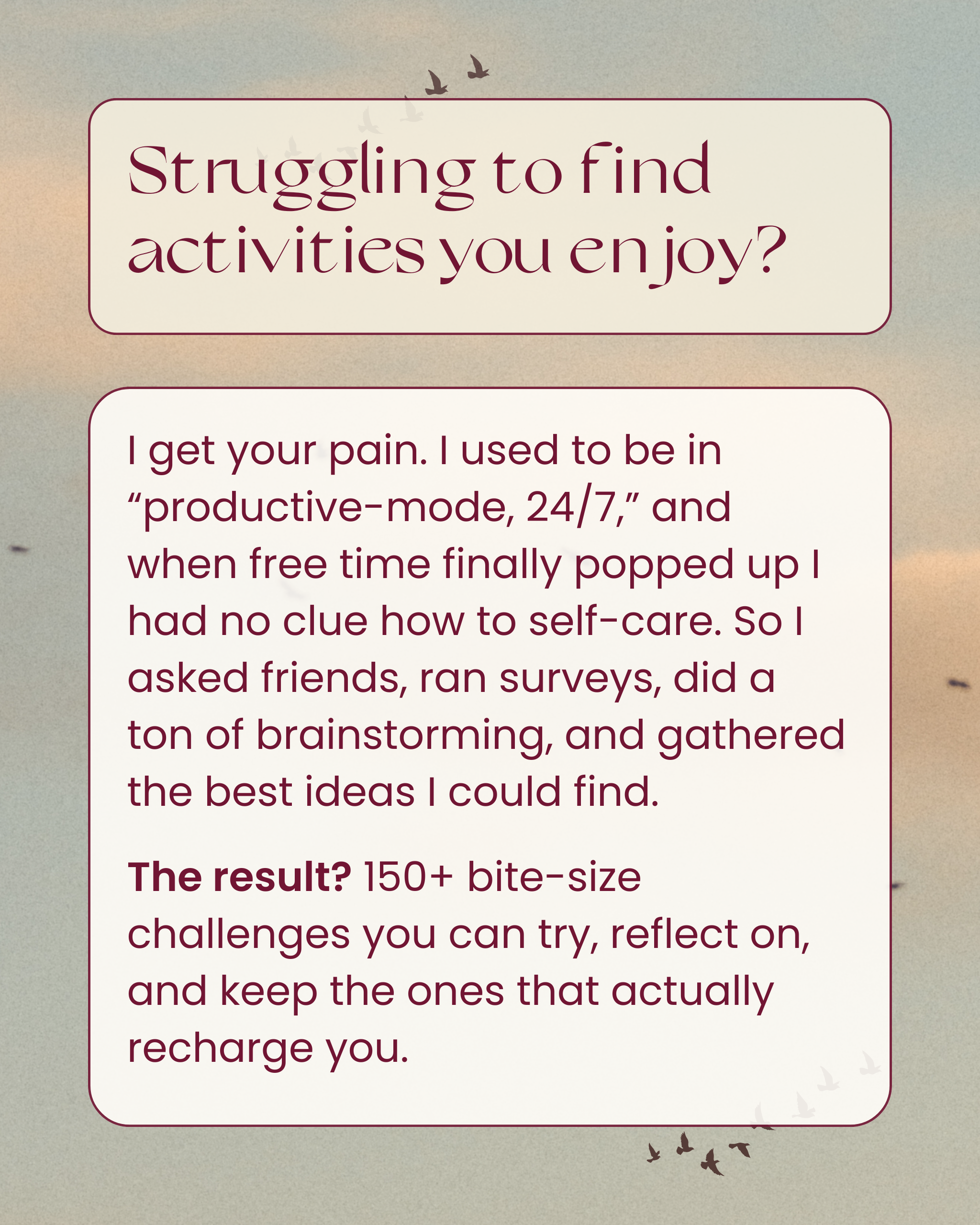 I've been on that self-improvement hamster wheel. Spending my whole days relentlessly following other people's idea on how my life should be. By mid-day, I'd be so tired of my "self-care" routine that I didn't have much energy for anything else.