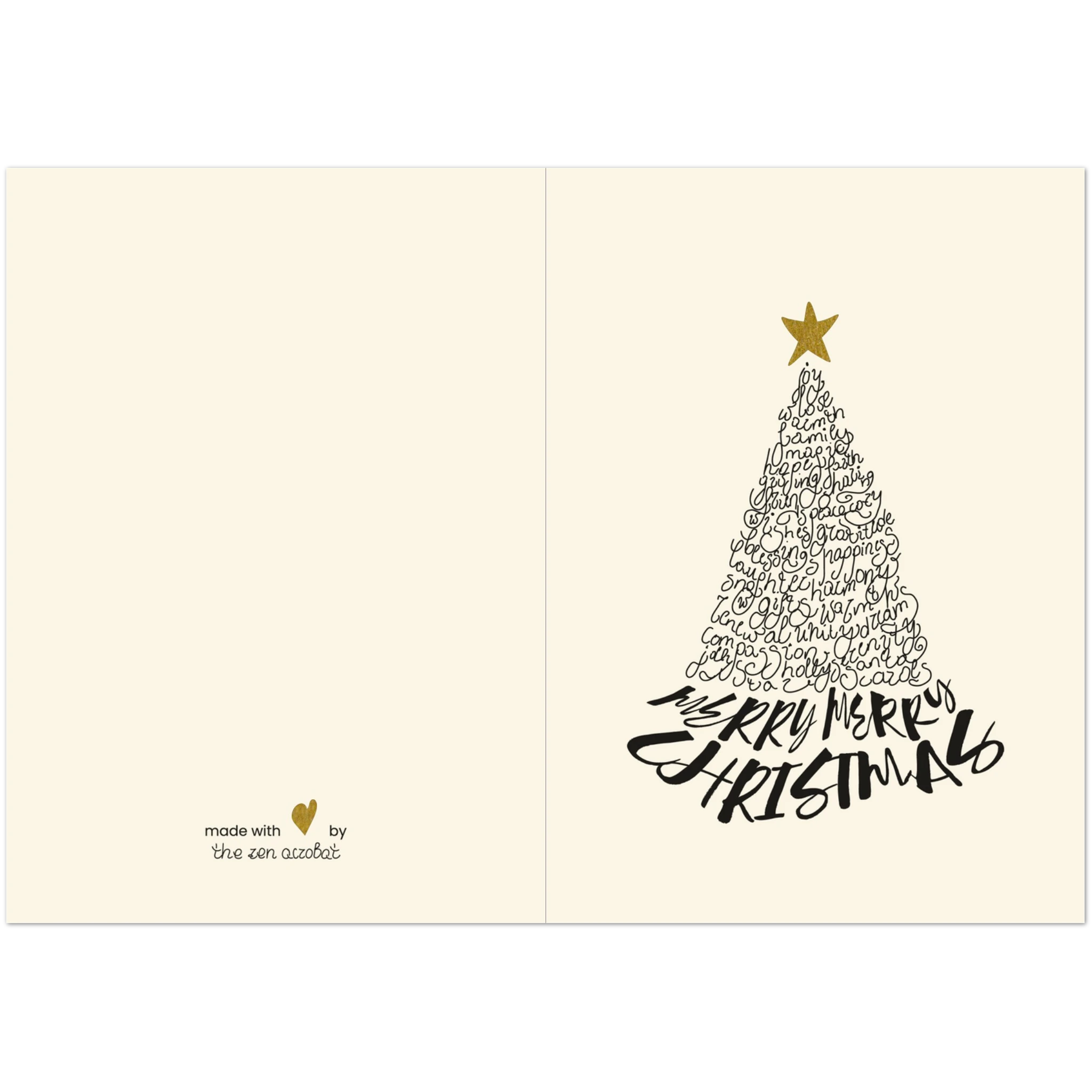 The magical Christmas tree in this 5×7 (US & CA) or A6 (EU and rest of world) Christmas card is made out of all the beautiful words that we use to describe the season of giving. Words such as joy, warmth, love, friends, family, blessings, gratitude.